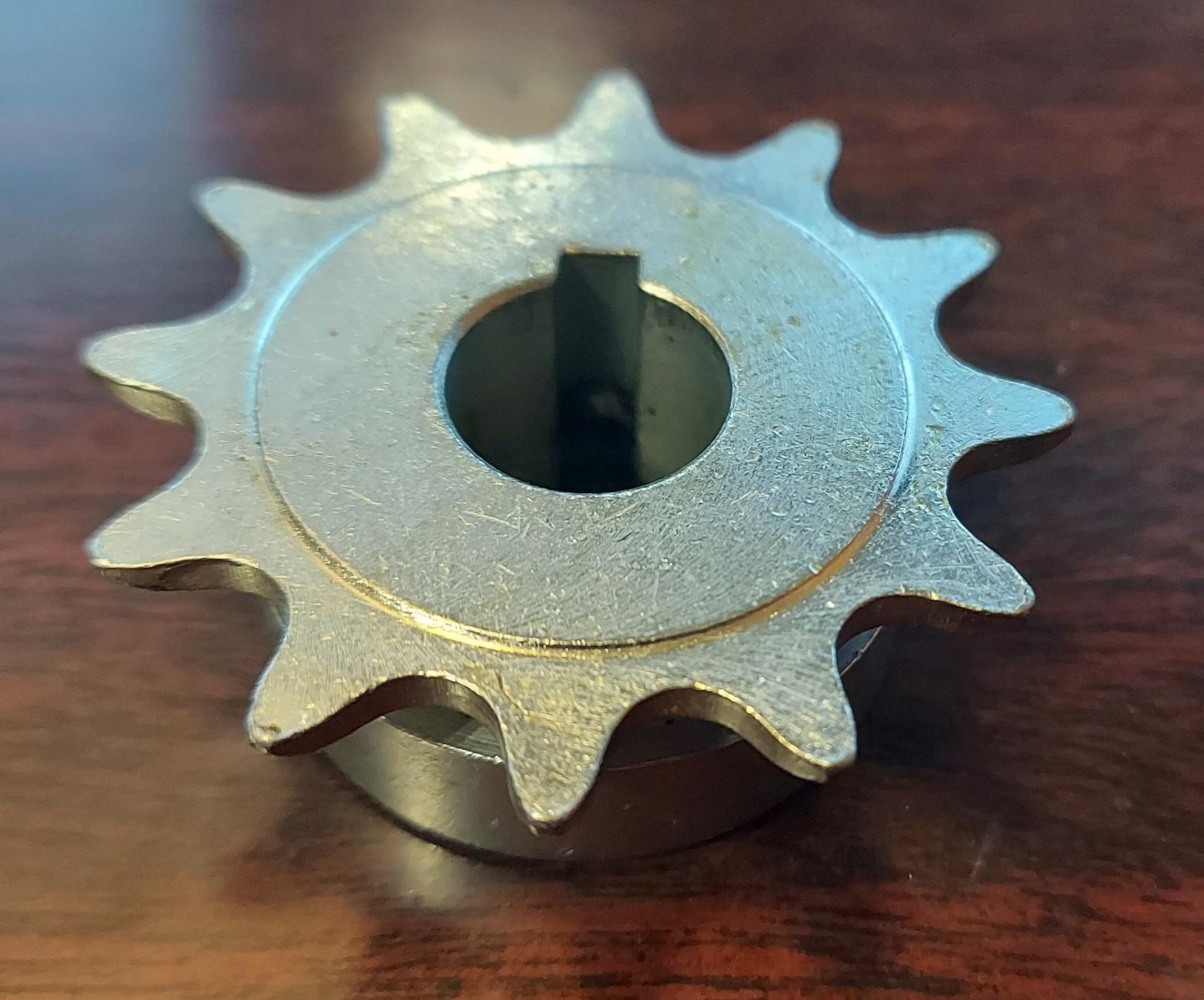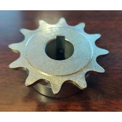 #43 or 410 B 12 Tooth Sprocket with a 5/8" ID, has a 3/16" keyway & two set screws. The sprocket width is .875" or 7/8". 1/2" Pitch x 1/8" width teeth. Finish: Plain Machined, Black Oxide or zinc will vary by what is on hand.