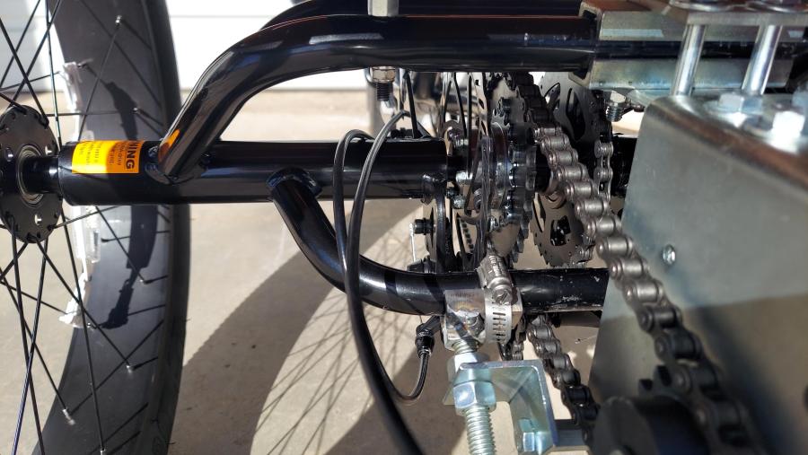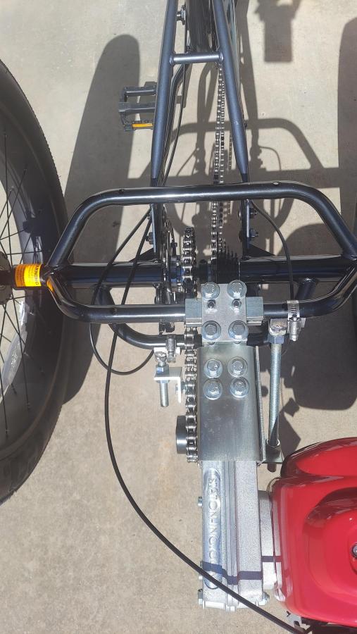 No drilling the frame. This kit has a custom made bolt on brackets and includes a #41 30 tooth cnc machined sprocket that attaches to an 18 tooth freewheel sprocket with Six chainring bolts on the custom cnc machined Disc Brake rotor & 17 mm freewheel adapter with a 4 mm x 4 mm x 25 mm long key, a replacement 17mm adaptor for the 7 speed freewheel along with a Double split shaft collar that allows enough room to install the 4 mm keys in both freewheels and lock the 7 speed freewheel in place. A #41 B 15 tooth sprocket on the gearbox is held in place by two snap ring groves and two set screws for the Disc brake / freewheel adaptor. This ratio is the standard and will get a top speed of about 24 mph. This will pull a 250+ rider with ease plus the weight of the trike.