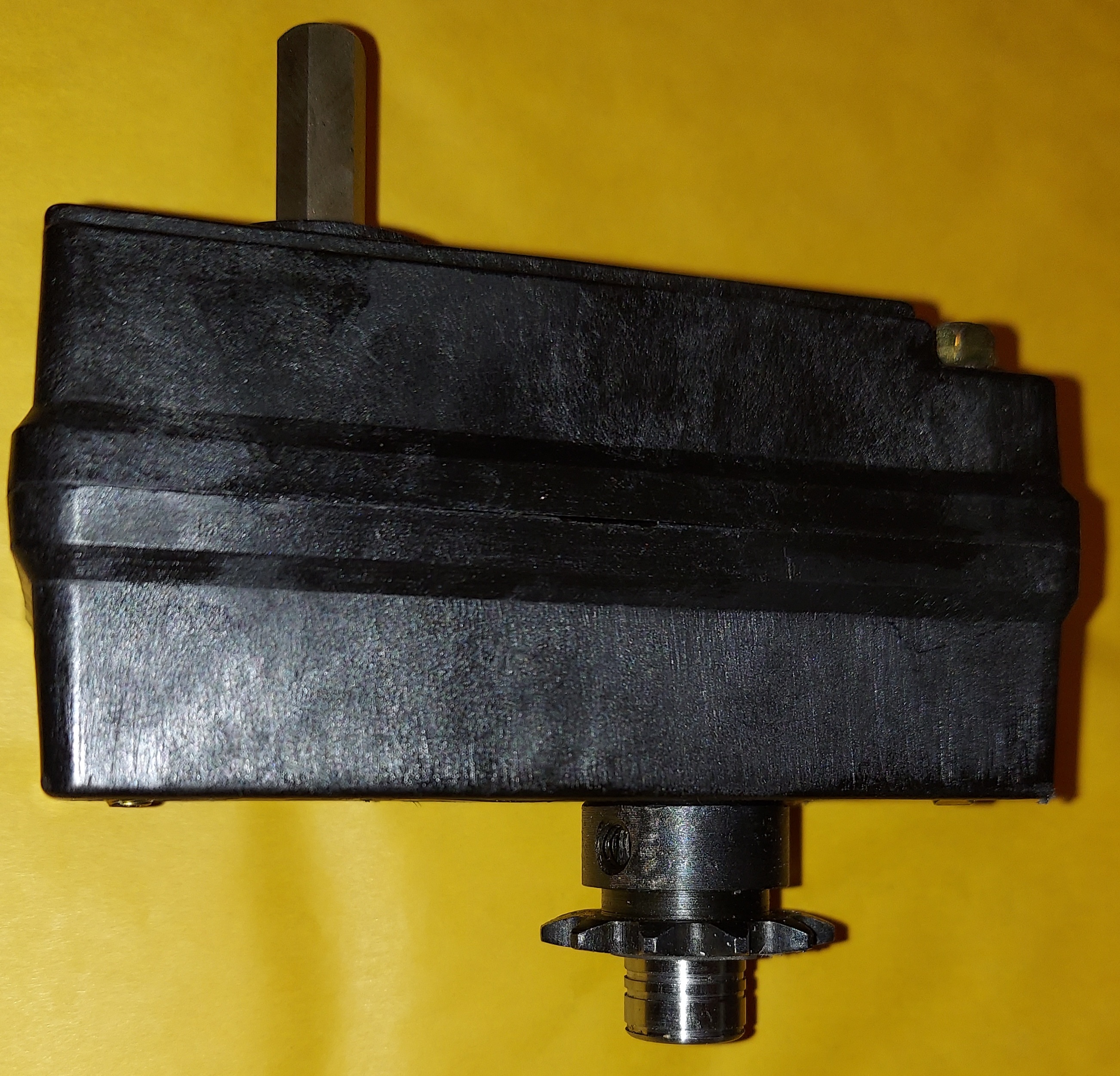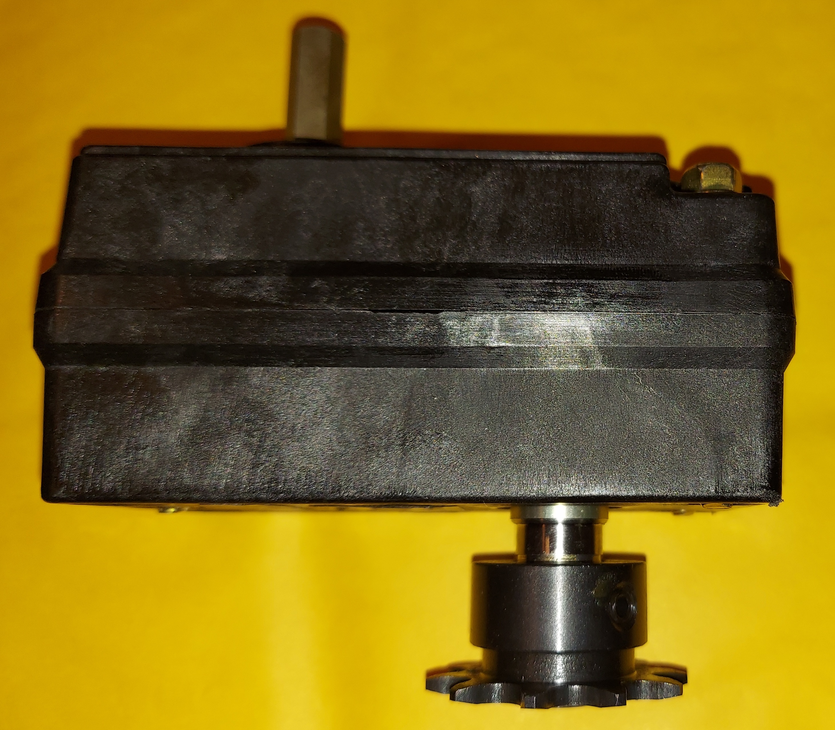 2 to 1 Gear reduction box with idler gear so the input and output 5/8" shaft with 3/16" keyway turns the same direction. We made a new 5/8" shaft with a 3/16" keyway so it is easier to use standard made sprockets and adaptors. Note: We also have a 18 mm shaft version Product ID: 0087